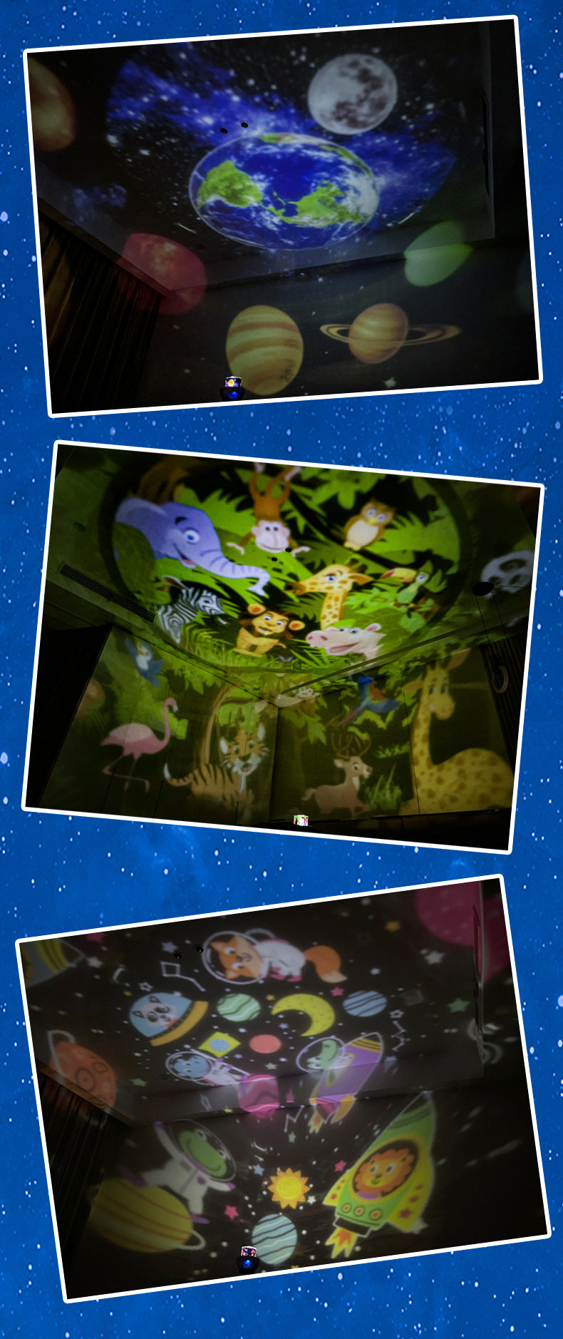 The projection effect is truly stunning, with lifelike and vibrant patterns available in a variety of exquisite themes, including starry skies, animals, and oceans. Changing the projector slides unlocks even more engaging images, making it a fun and educational experience for the whole family. The projection area reaches up to 30 square meters, and with diffuse reflection technology, the light is soft and non-glare. It also supports five levels of brightness adjustment, making it perfect for creating a romantic atmosphere, lulling children to sleep, or providing early childhood education.